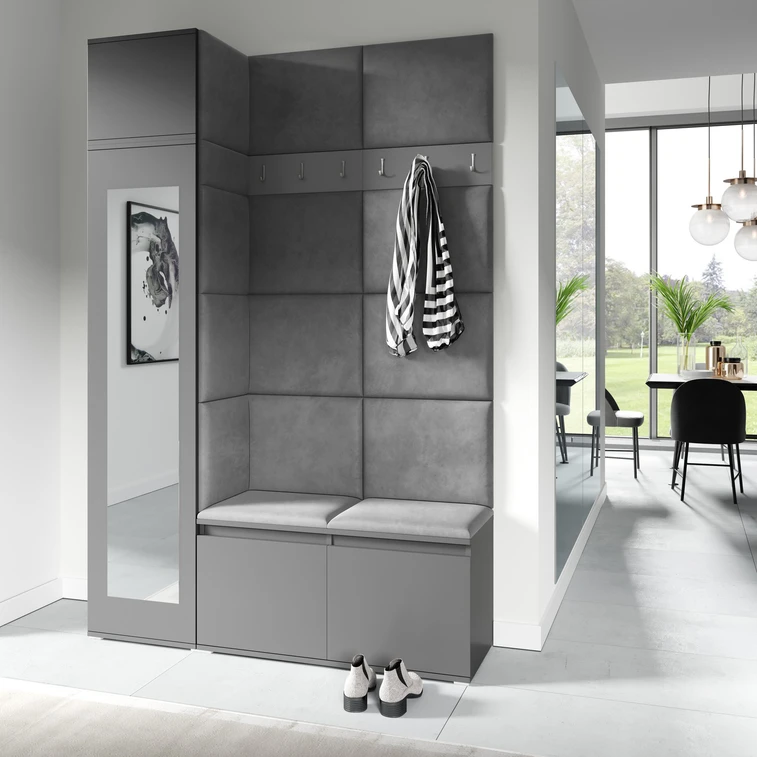 Predsieňová stena Emi 22. Obsahuje: 1x šatníková skriňa so zrkadlom, 1x závesná skrinka, 1x botník, 1x vešiak, 15x čalúnené panely. Čalúnené panely sa montujú priamo na stenu, na skriňu a na botník pomocou lepidla. Lepidlo nie je súčasťou balenia.