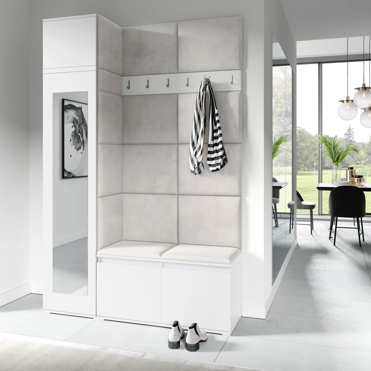 Predsieňová stena Emi 22. Obsahuje: 1x šatníková skriňa so zrkadlom, 1x závesná skrinka, 1x botník, 1x vešiak, 15x čalúnené panely. Čalúnené panely sa montujú priamo na stenu, na skriňu a na botník pomocou lepidla. Lepidlo nie je súčasťou balenia.