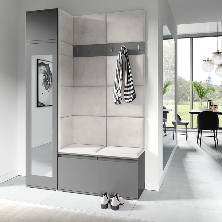 Predsieňová stena Emi 22. Obsahuje: 1x šatníková skriňa so zrkadlom, 1x závesná skrinka, 1x botník, 1x vešiak, 15x čalúnené panely. Čalúnené panely sa montujú priamo na stenu, na skriňu a na botník pomocou lepidla. Lepidlo nie je súčasťou balenia.