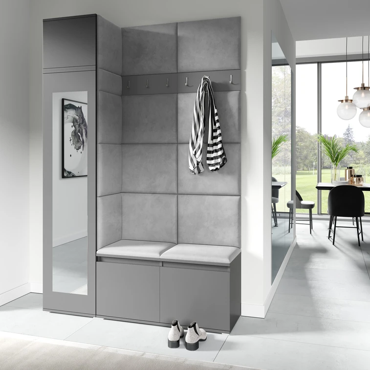 Predsieňová stena Emi 22. Obsahuje: 1x šatníková skriňa so zrkadlom, 1x závesná skrinka, 1x botník, 1x vešiak, 15x čalúnené panely. Čalúnené panely sa montujú priamo na stenu, na skriňu a na botník pomocou lepidla. Lepidlo nie je súčasťou balenia.