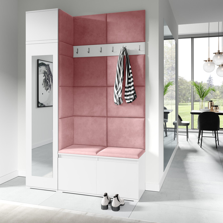 Predsieňová stena Emi 22. Obsahuje: 1x šatníková skriňa so zrkadlom, 1x závesná skrinka, 1x botník, 1x vešiak, 15x čalúnené panely. Čalúnené panely sa montujú priamo na stenu, na skriňu a na botník pomocou lepidla. Lepidlo nie je súčasťou balenia.