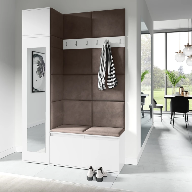 Predsieňová stena Emi 22. Obsahuje: 1x šatníková skriňa so zrkadlom, 1x závesná skrinka, 1x botník, 1x vešiak, 15x čalúnené panely. Čalúnené panely sa montujú priamo na stenu, na skriňu a na botník pomocou lepidla. Lepidlo nie je súčasťou balenia.