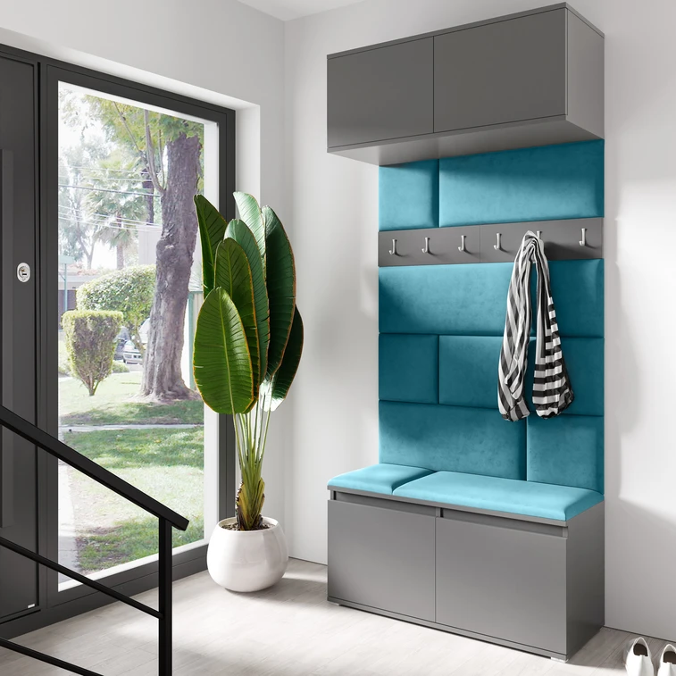Predsieňová stena Emi 23. Obsahuje: 1x závesná skrinka, 1 botník, 1x vešiak, 10x čalúnené panely. Čalúnené panely sa montujú priamo na stenu a na botník pomocou lepidla. Lepidlo nie je súčasťou balenia.
