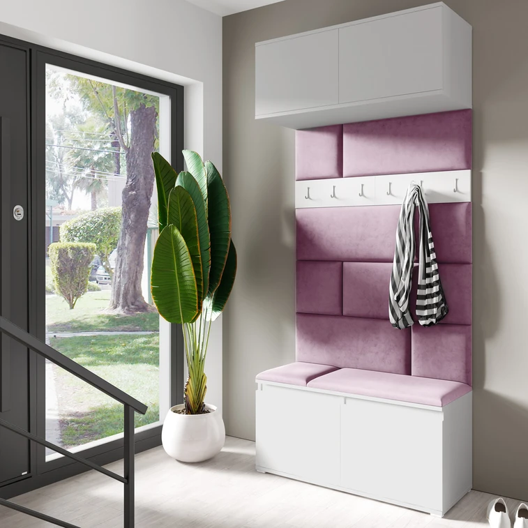 Predsieňová stena Emi 23. Obsahuje: 1x závesná skrinka, 1 botník, 1x vešiak, 10x čalúnené panely. Čalúnené panely sa montujú priamo na stenu a na botník pomocou lepidla. Lepidlo nie je súčasťou balenia.