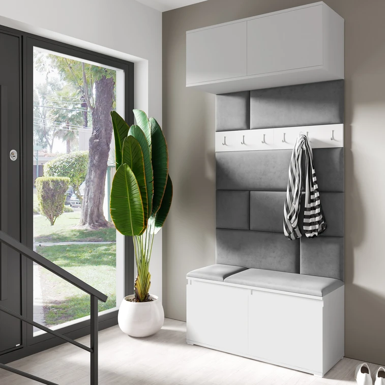 Predsieňová stena Emi 23. Obsahuje: 1x závesná skrinka, 1 botník, 1x vešiak, 10x čalúnené panely. Čalúnené panely sa montujú priamo na stenu a na botník pomocou lepidla. Lepidlo nie je súčasťou balenia.