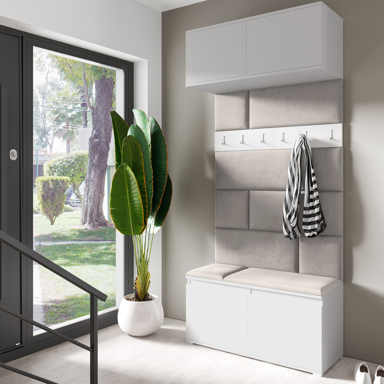 Predsieňová stena Emi 23. Obsahuje: 1x závesná skrinka, 1 botník, 1x vešiak, 10x čalúnené panely. Čalúnené panely sa montujú priamo na stenu a na botník pomocou lepidla. Lepidlo nie je súčasťou balenia.