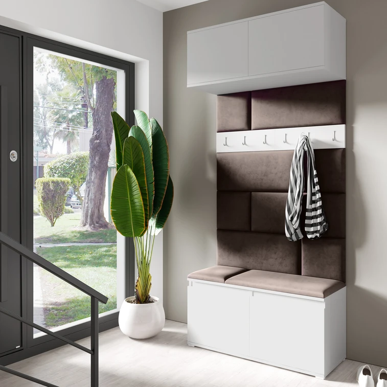 Predsieňová stena Emi 23. Obsahuje: 1x závesná skrinka, 1 botník, 1x vešiak, 10x čalúnené panely. Čalúnené panely sa montujú priamo na stenu a na botník pomocou lepidla. Lepidlo nie je súčasťou balenia.
