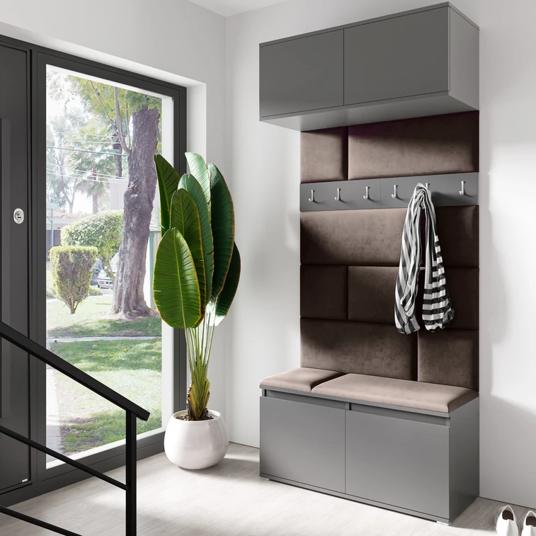 Predsieňová stena Emi 23. Obsahuje: 1x závesná skrinka, 1 botník, 1x vešiak, 10x čalúnené panely. Čalúnené panely sa montujú priamo na stenu a na botník pomocou lepidla. Lepidlo nie je súčasťou balenia.