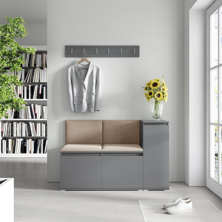 Predsieňová stena Emi 25. Obsahuje: 1x komoda, 1x botník, 1x vešiak, 4x čalúnené panely. Čalúnené panely sa montujú priamo na stenu a na botník pomocou lepidla. Lepidlo nie je súčasťou balenia.