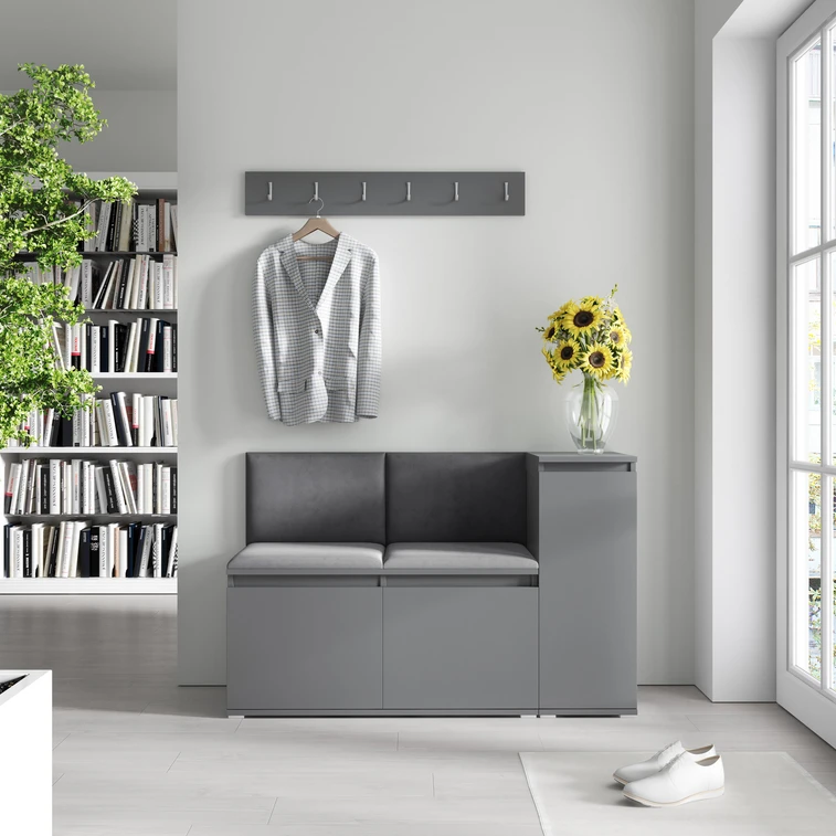 Predsieňová stena Emi 25. Obsahuje: 1x komoda, 1x botník, 1x vešiak, 4x čalúnené panely. Čalúnené panely sa montujú priamo na stenu a na botník pomocou lepidla. Lepidlo nie je súčasťou balenia.