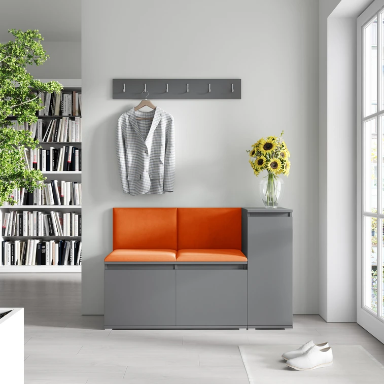 Predsieňová stena Emi 25. Obsahuje: 1x komoda, 1x botník, 1x vešiak, 4x čalúnené panely. Čalúnené panely sa montujú priamo na stenu a na botník pomocou lepidla. Lepidlo nie je súčasťou balenia.