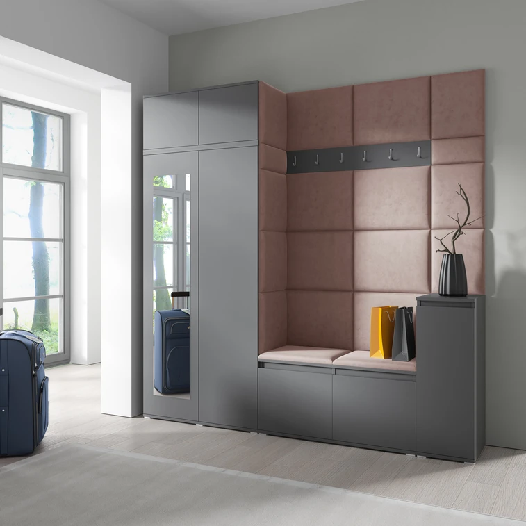 Predsieňová stena Emi 26. Obsahuje: 1x šatníková skriňa so zrkadlom, 1x regál ku skrini, 1x komoda, 1x botník, 1x vešiak, 19x čalúnené panely. Čalúnené panely sa montujú priamo na stenu a na šatníkovú skriňu pomocou lepidla. Lepidlo nie je súčasťou balenia.