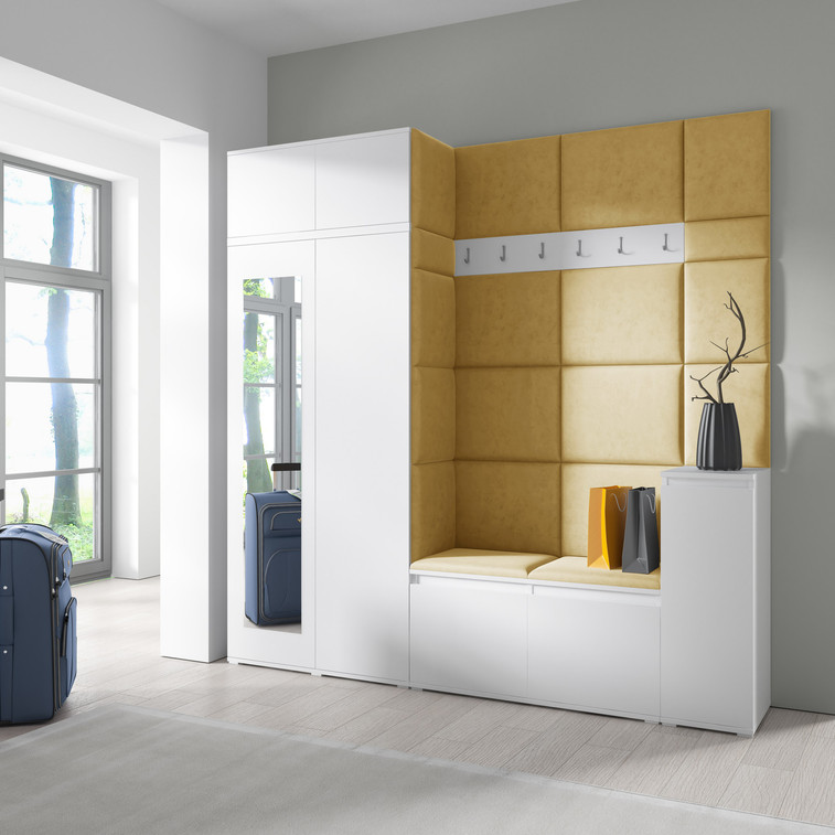 Predsieňová stena Emi 26. Obsahuje: 1x šatníková skriňa so zrkadlom, 1x regál ku skrini, 1x komoda, 1x botník, 1x vešiak, 19x čalúnené panely. Čalúnené panely sa montujú priamo na stenu a na šatníkovú skriňu pomocou lepidla. Lepidlo nie je súčasťou balenia.