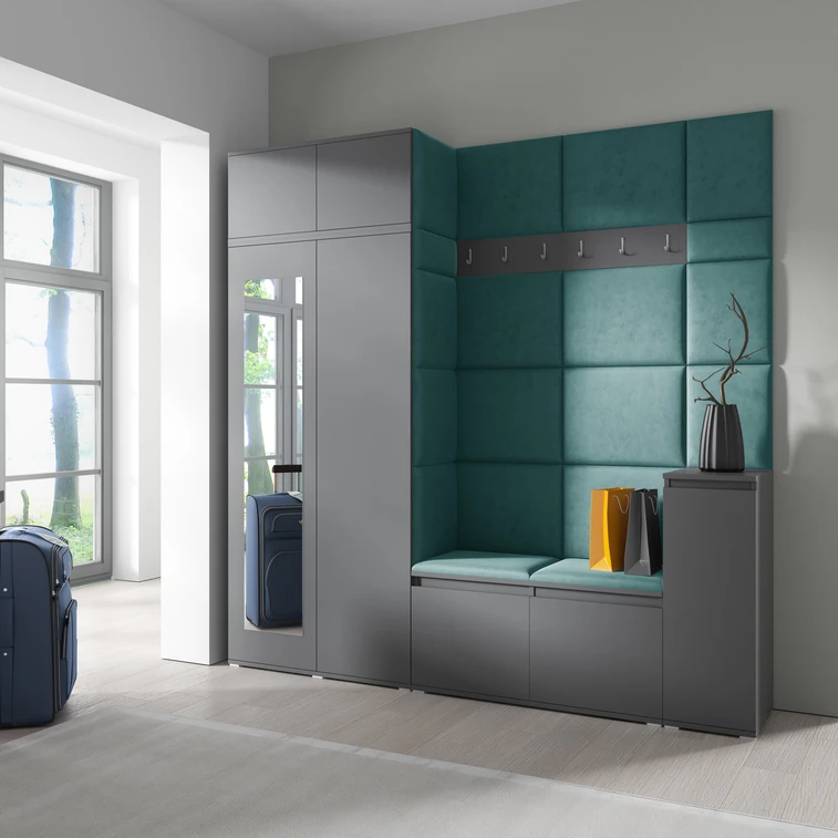 Predsieňová stena Emi 26. Obsahuje: 1x šatníková skriňa so zrkadlom, 1x regál ku skrini, 1x komoda, 1x botník, 1x vešiak, 19x čalúnené panely. Čalúnené panely sa montujú priamo na stenu a na šatníkovú skriňu pomocou lepidla. Lepidlo nie je súčasťou balenia.
