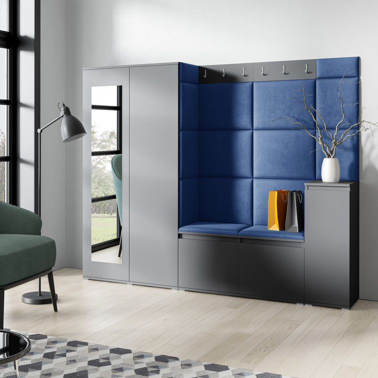 Predsieňová stena Emi 27. Obsahuje: 1x šatníková skriňa so zrkadlom, 1x komoda, 1x botník, 1x vešiak, 15x čalúnené panely. Čalúnené panely sa montujú priamo na stenu a na šatníkovú skriňu pomocou lepidla. Lepidlo nie je súčasťou balenia.
