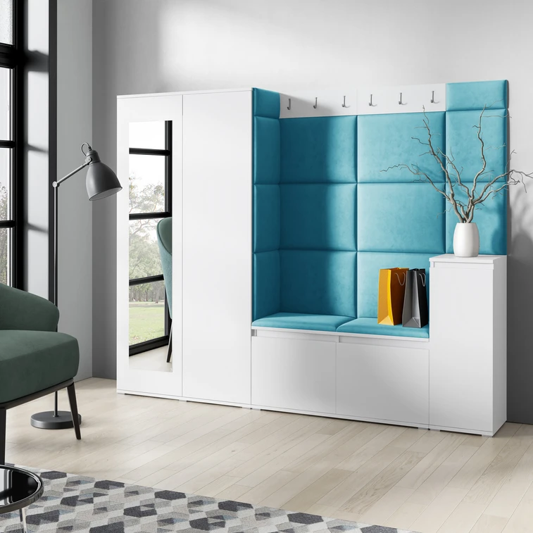 Predsieňová stena Emi 27. Obsahuje: 1x šatníková skriňa so zrkadlom, 1x komoda, 1x botník, 1x vešiak, 15x čalúnené panely. Čalúnené panely sa montujú priamo na stenu a na šatníkovú skriňu pomocou lepidla. Lepidlo nie je súčasťou balenia.
