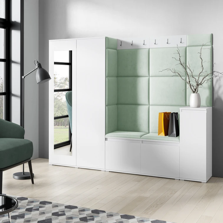 Predsieňová stena Emi 27. Obsahuje: 1x šatníková skriňa so zrkadlom, 1x komoda, 1x botník, 1x vešiak, 15x čalúnené panely. Čalúnené panely sa montujú priamo na stenu a na šatníkovú skriňu pomocou lepidla. Lepidlo nie je súčasťou balenia.