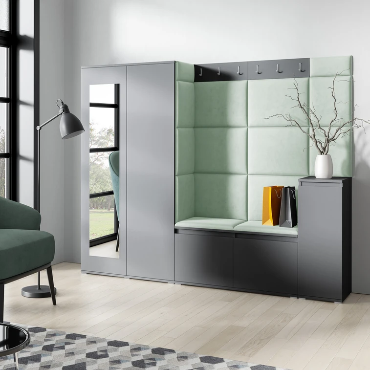 Predsieňová stena Emi 27. Obsahuje: 1x šatníková skriňa so zrkadlom, 1x komoda, 1x botník, 1x vešiak, 15x čalúnené panely. Čalúnené panely sa montujú priamo na stenu a na šatníkovú skriňu pomocou lepidla. Lepidlo nie je súčasťou balenia.