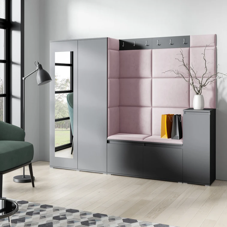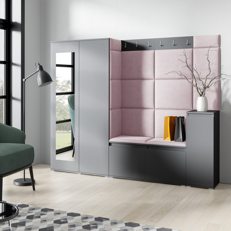 Predsieňová stena Emi 27. Obsahuje: 1x šatníková skriňa so zrkadlom, 1x komoda, 1x botník, 1x vešiak, 15x čalúnené panely. Čalúnené panely sa montujú priamo na stenu a na šatníkovú skriňu pomocou lepidla. Lepidlo nie je súčasťou balenia.