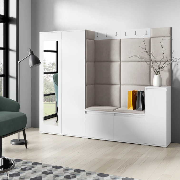 Predsieňová stena Emi 27. Obsahuje: 1x šatníková skriňa so zrkadlom, 1x komoda, 1x botník, 1x vešiak, 15x čalúnené panely. Čalúnené panely sa montujú priamo na stenu a na šatníkovú skriňu pomocou lepidla. Lepidlo nie je súčasťou balenia.