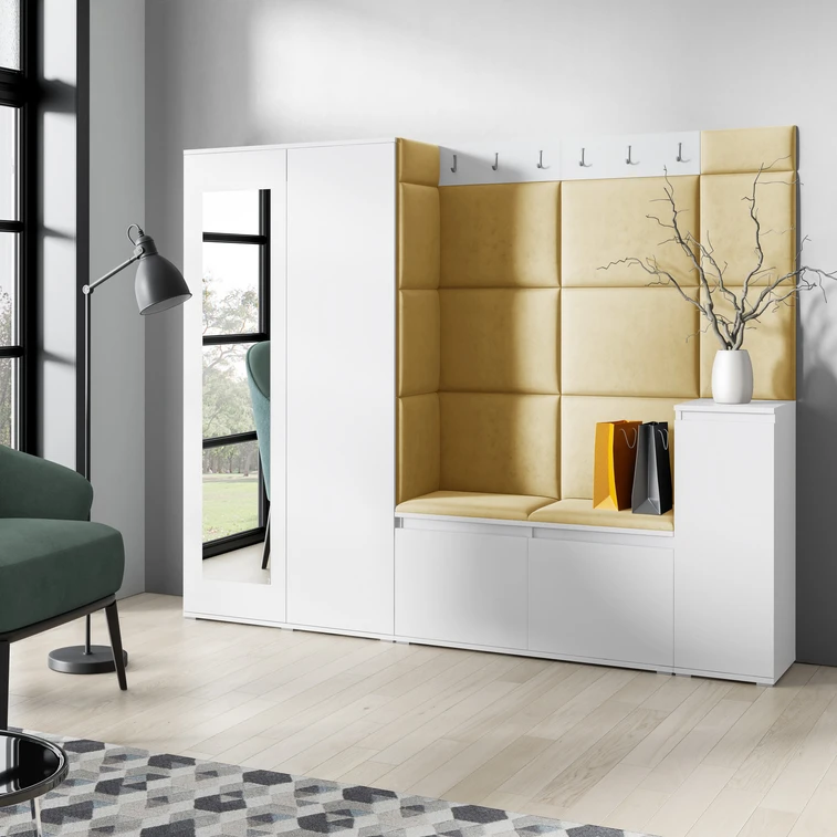 Predsieňová stena Emi 27. Obsahuje: 1x šatníková skriňa so zrkadlom, 1x komoda, 1x botník, 1x vešiak, 15x čalúnené panely. Čalúnené panely sa montujú priamo na stenu a na šatníkovú skriňu pomocou lepidla. Lepidlo nie je súčasťou balenia.
