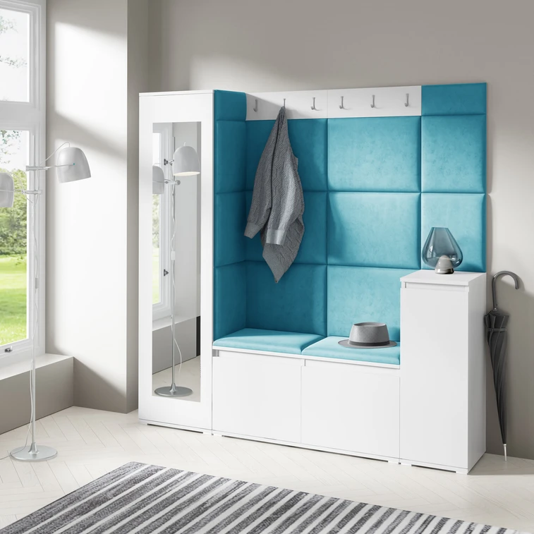 Predsieňová stena AMI 28, je moderný a praktický prvok do vstupných priestorov vášho domu. Predsieňová stena obsahuje pätnásť čalúnených panelov, ktoré sa montujú priamo na stenu za pomoci lepidla. Poťah botníku je tkanina TRINITY, ktorá je mäkká a príjemná na dotyk. Ide o velúrovú tkaninu. Predsieňová stena sa skladá z niekoľkých častí.