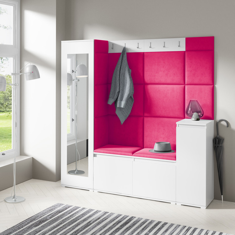 Predsieňová stena AMI 28, je moderný a praktický prvok do vstupných priestorov vášho domu. Predsieňová stena obsahuje pätnásť čalúnených panelov, ktoré sa montujú priamo na stenu za pomoci lepidla. Poťah botníku je tkanina TRINITY, ktorá je mäkká a príjemná na dotyk. Ide o velúrovú tkaninu. Predsieňová stena sa skladá z niekoľkých častí.