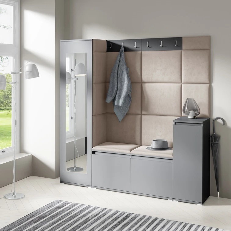 Predsieňová stena AMI 28, je moderný a praktický prvok do vstupných priestorov vášho domu. Predsieňová stena obsahuje pätnásť čalúnených panelov, ktoré sa montujú priamo na stenu za pomoci lepidla. Poťah botníku je tkanina TRINITY, ktorá je mäkká a príjemná na dotyk. Ide o velúrovú tkaninu. Predsieňová stena sa skladá z niekoľkých častí.