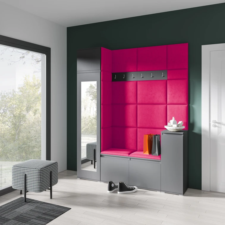 Predsieňová stena Emi 29. Obsahuje: 1x šatníkovú skriňu so zrkadlom, 1x regál ku skrini, 1x komoda, 1x botník, 1x vešiak, 19x čalúnené panely. Čalúnené panely sa montujú priamo na stenu a na šatníkovú skriňu pomocou lepidla. Lepidlo nie je súčasťou balenia.