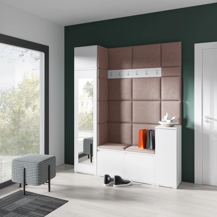 Predsieňová stena Emi 29. Obsahuje: 1x šatníkovú skriňu so zrkadlom, 1x regál ku skrini, 1x komoda, 1x botník, 1x vešiak, 19x čalúnené panely. Čalúnené panely sa montujú priamo na stenu a na šatníkovú skriňu pomocou lepidla. Lepidlo nie je súčasťou balenia.
