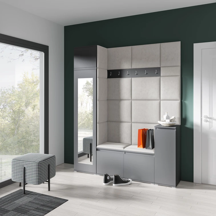 Predsieňová stena Emi 29. Obsahuje: 1x šatníkovú skriňu so zrkadlom, 1x regál ku skrini, 1x komoda, 1x botník, 1x vešiak, 19x čalúnené panely. Čalúnené panely sa montujú priamo na stenu a na šatníkovú skriňu pomocou lepidla. Lepidlo nie je súčasťou balenia.