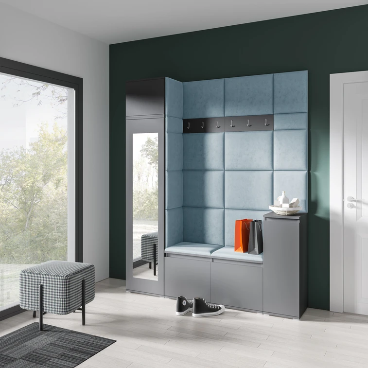 Predsieňová stena Emi 29. Obsahuje: 1x šatníkovú skriňu so zrkadlom, 1x regál ku skrini, 1x komoda, 1x botník, 1x vešiak, 19x čalúnené panely. Čalúnené panely sa montujú priamo na stenu a na šatníkovú skriňu pomocou lepidla. Lepidlo nie je súčasťou balenia.