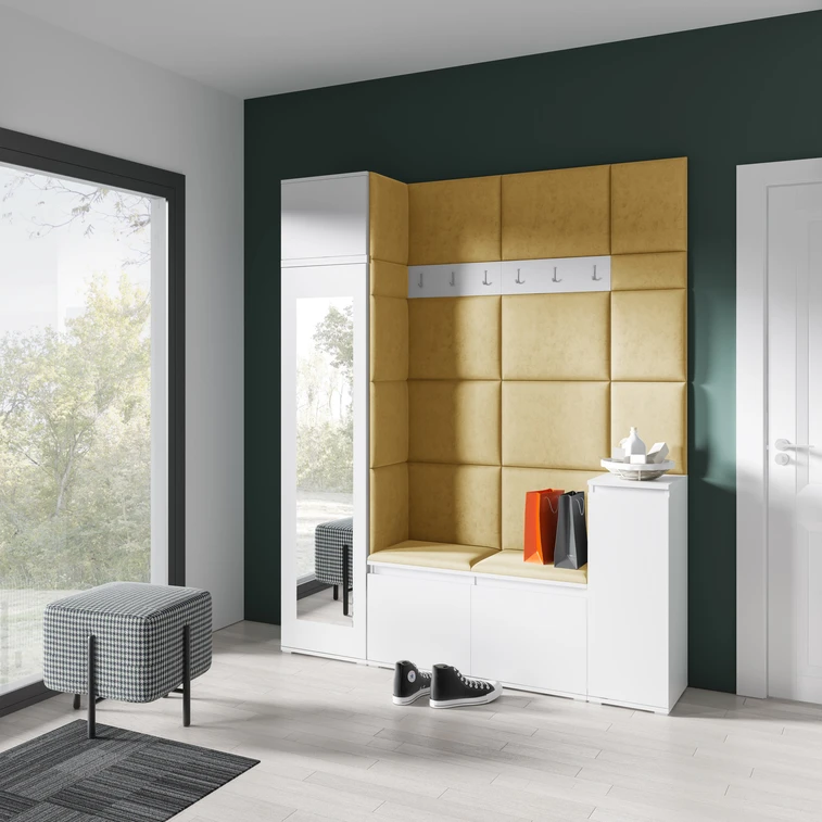 Predsieňová stena Emi 29. Obsahuje: 1x šatníkovú skriňu so zrkadlom, 1x regál ku skrini, 1x komoda, 1x botník, 1x vešiak, 19x čalúnené panely. Čalúnené panely sa montujú priamo na stenu a na šatníkovú skriňu pomocou lepidla. Lepidlo nie je súčasťou balenia.