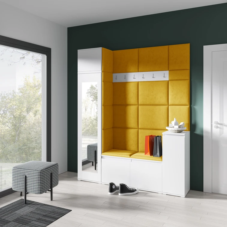 Predsieňová stena Emi 29. Obsahuje: 1x šatníkovú skriňu so zrkadlom, 1x regál ku skrini, 1x komoda, 1x botník, 1x vešiak, 19x čalúnené panely. Čalúnené panely sa montujú priamo na stenu a na šatníkovú skriňu pomocou lepidla. Lepidlo nie je súčasťou balenia.