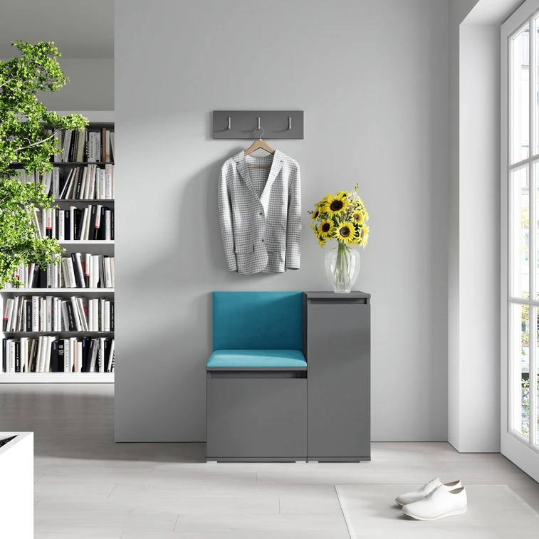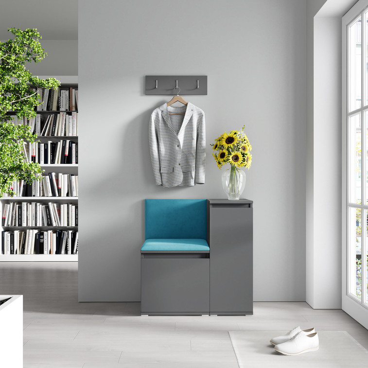 Predsieňová stena Emi 30. Obsahuje: 1x komoda, 1x botník, 1x vešiak, 2x čalúnené panely. Čalúnené panely sa montujú priamo na stenu a na šatníkovú skriňu pomocou lepidla. Lepidlo nie je súčasťou balenia.