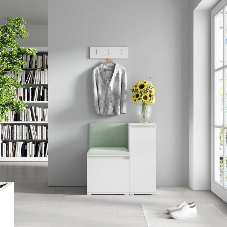Predsieňová stena Emi 30. Obsahuje: 1x komoda, 1x botník, 1x vešiak, 2x čalúnené panely. Čalúnené panely sa montujú priamo na stenu a na šatníkovú skriňu pomocou lepidla. Lepidlo nie je súčasťou balenia.