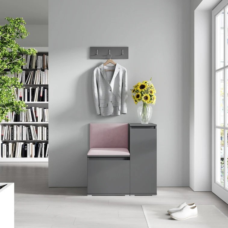 Predsieňová stena Emi 30. Obsahuje: 1x komoda, 1x botník, 1x vešiak, 2x čalúnené panely. Čalúnené panely sa montujú priamo na stenu a na šatníkovú skriňu pomocou lepidla. Lepidlo nie je súčasťou balenia.