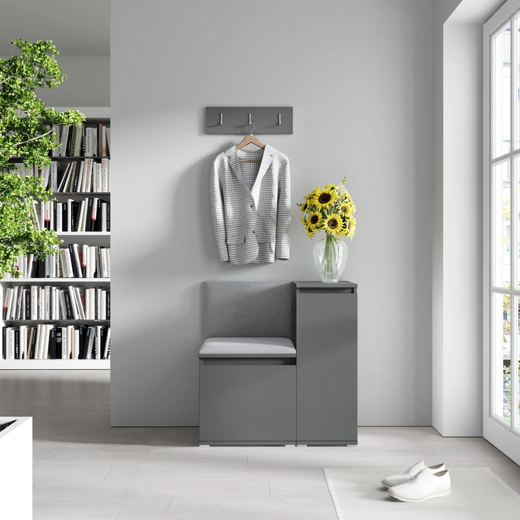 Predsieňová stena Emi 30. Obsahuje: 1x komoda, 1x botník, 1x vešiak, 2x čalúnené panely. Čalúnené panely sa montujú priamo na stenu a na šatníkovú skriňu pomocou lepidla. Lepidlo nie je súčasťou balenia.