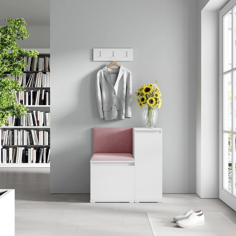 Predsieňová stena Emi 30. Obsahuje: 1x komoda, 1x botník, 1x vešiak, 2x čalúnené panely. Čalúnené panely sa montujú priamo na stenu a na šatníkovú skriňu pomocou lepidla. Lepidlo nie je súčasťou balenia.