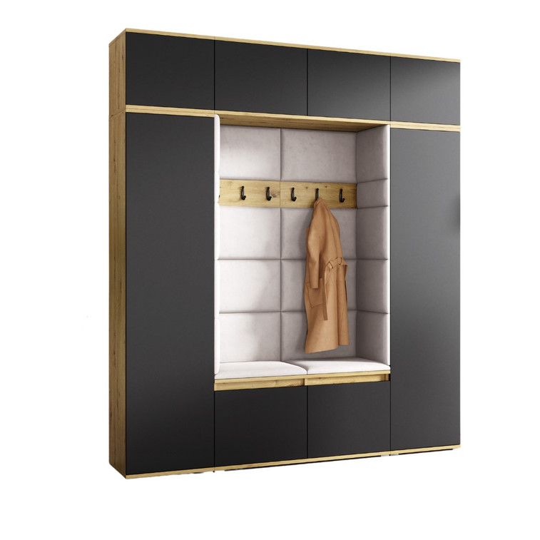 Moderná predsieňová stena Ami 32, je praktický prvok do vstupných priestorov vášho domu. Predsieňová stena obsahuje čalúnené panely, ktoré sa montujú priamo na stenu za pomoci lepidla. Poťah panelov je tkanina Trinity. Predsieňová stena sa skladá z niekoľkých častí.