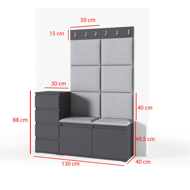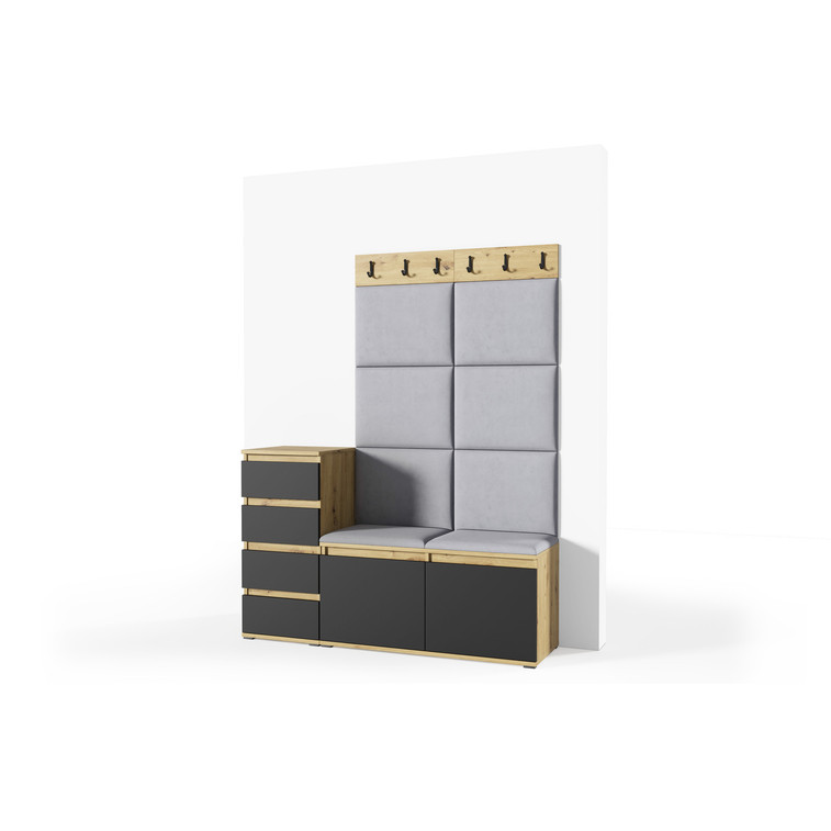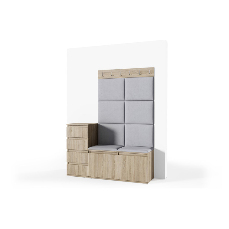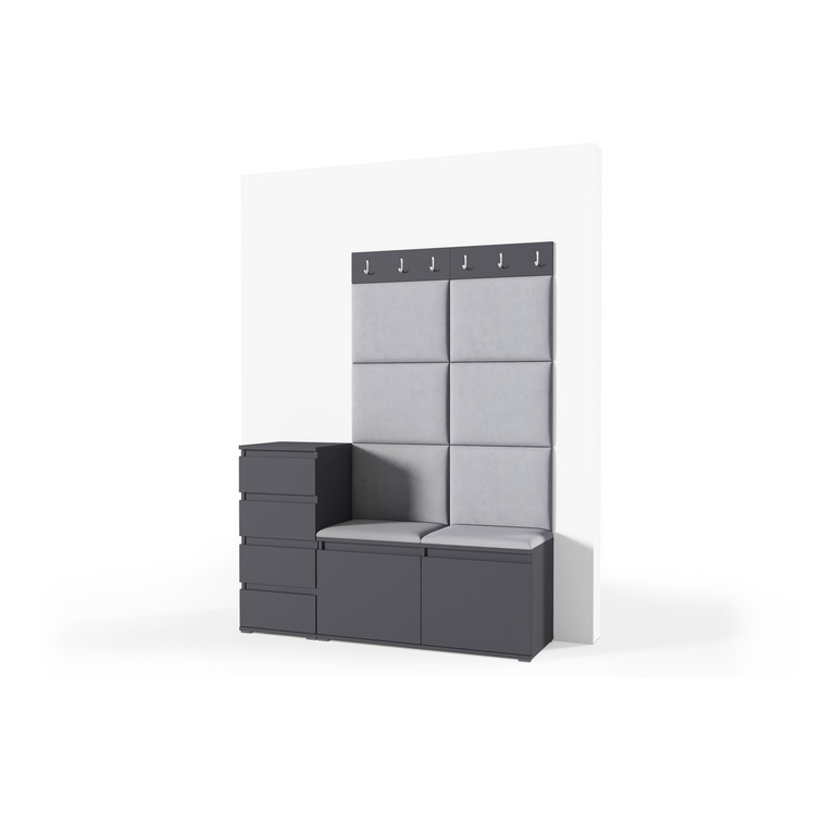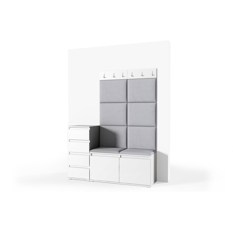 Je to praktický prvok do vstupných priestorov vášho domu. Predsieňová stena obsahuje čalúnené panely, ktoré sa montujú priamo na stenu za pomoci lepidla. Poťah panelov je tkanina Trinity. Predsieňová stena sa skladá z niekoľkých častí.