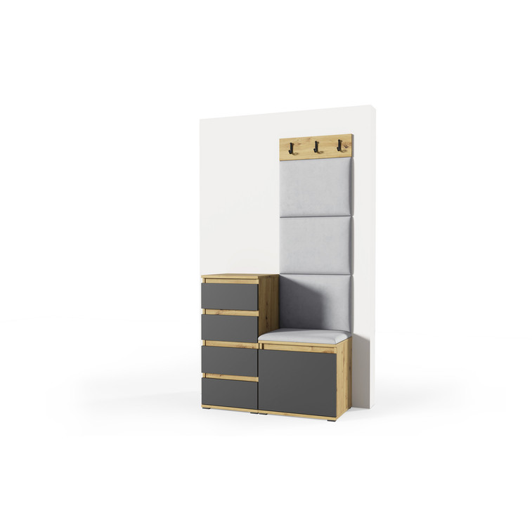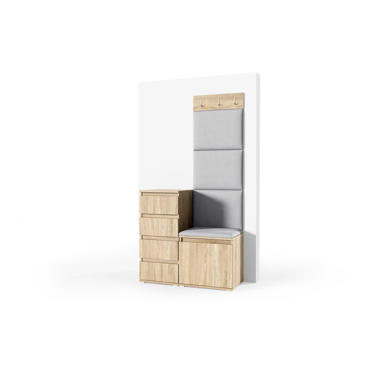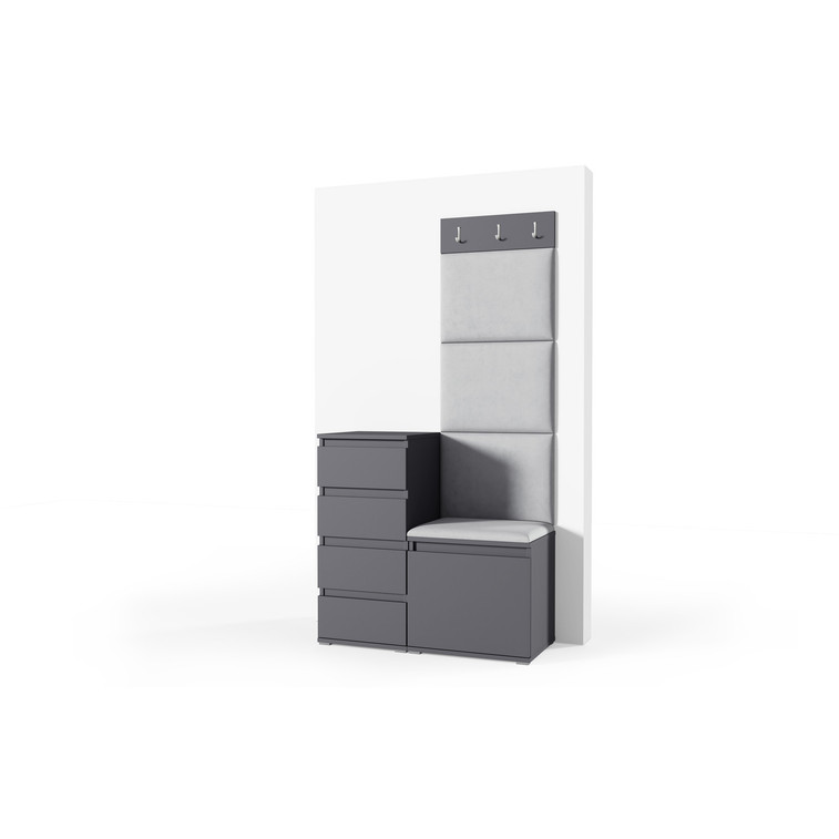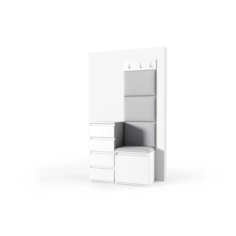 Je to praktický prvok do vstupných priestorov vášho domu. Predsieňová stena obsahuje čalúnené panely, ktoré sa montujú priamo na stenu za pomoci lepidla. Poťah panelov je tkanina Trinity. Predsieňová stena sa skladá z niekoľkých častí.