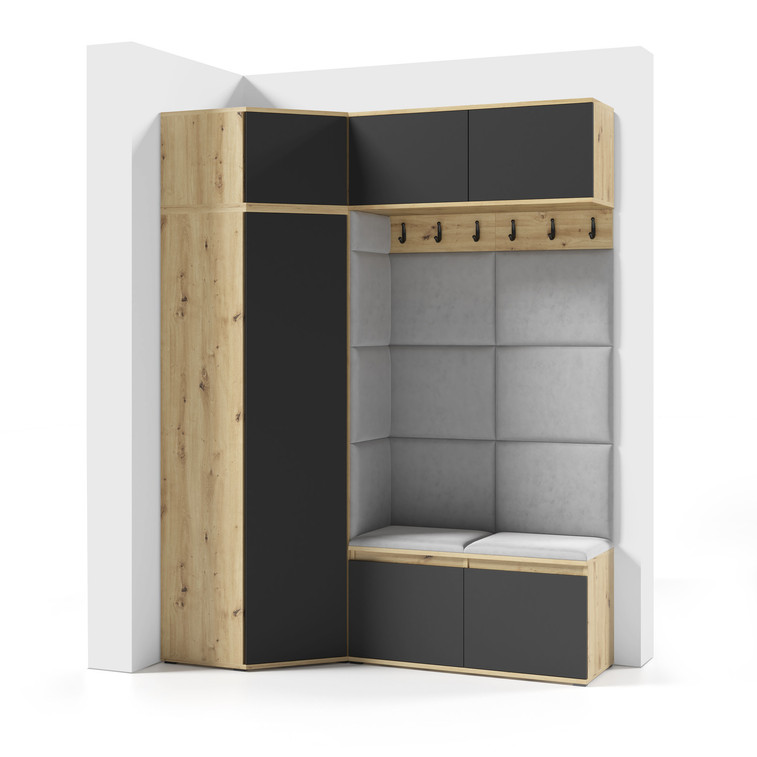 Je to praktický prvok do vstupných priestorov vášho domu. Predsieňová stena obsahuje čalúnené panely, ktoré sa montujú priamo na stenu za pomoci lepidla. Poťah panelov je tkanina Trinity. Predsieňová stena sa skladá z niekoľkých častí.