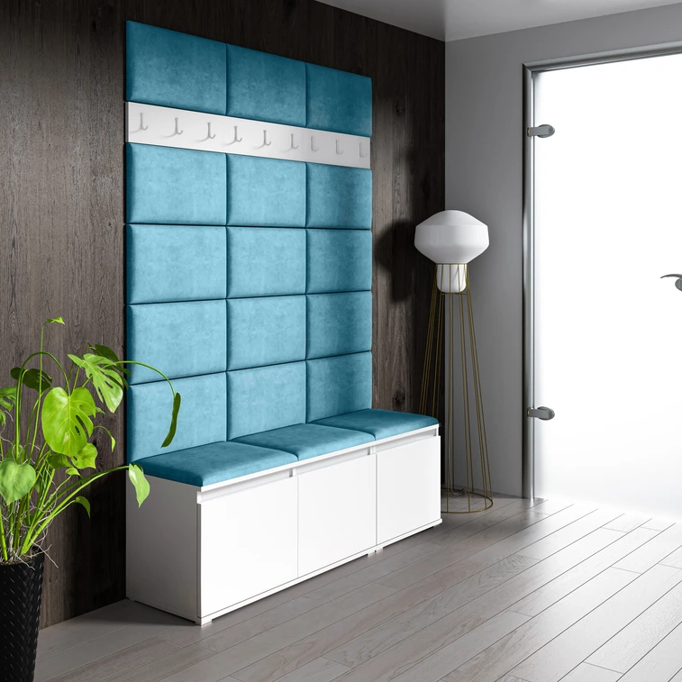 Predsieňová stena Emi 6. Obsahuje: botník, vešiak, 18x čalúnené panely. Čalúnené panely sa montujú priamo na stenu, na skriňu a na botník pomocou lepidla. Lepidlo nie je súčasťou balenia.