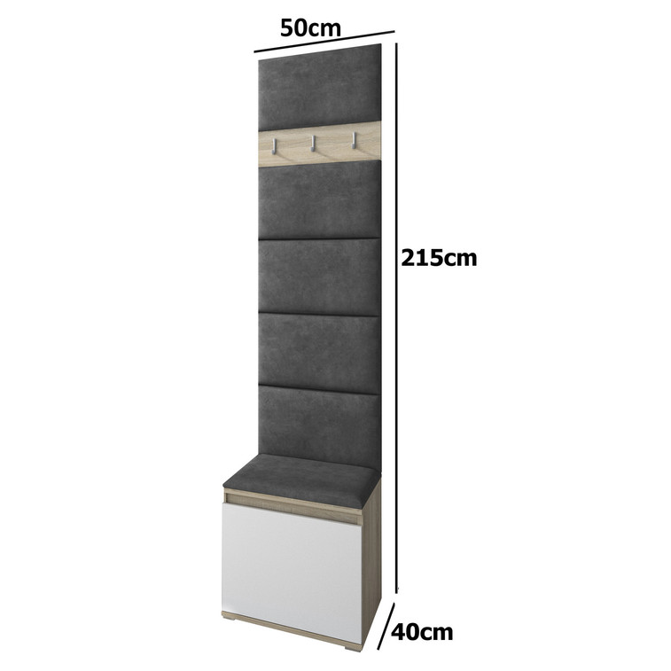 Predsieňová stena Emi 7. Obsahuje: 1x botník, 1x vešiak, 6x čalúnené panely. Čalúnené panely sa montujú priamo na stenu, na skriňu a na botník pomocou lepidla. Lepidlo nie je súčasťou balenia.