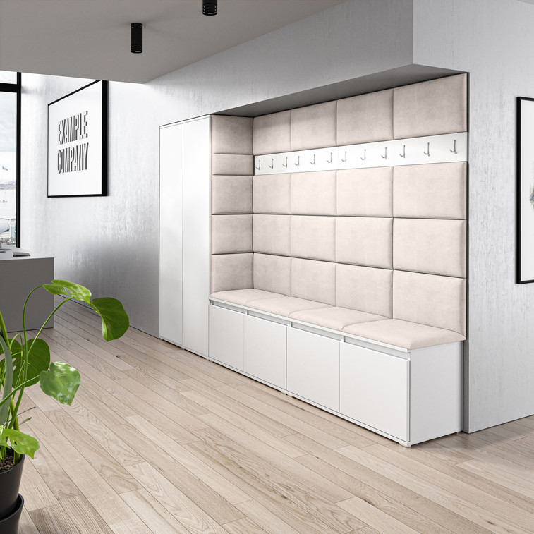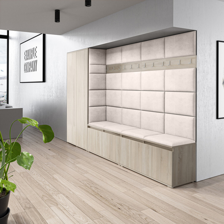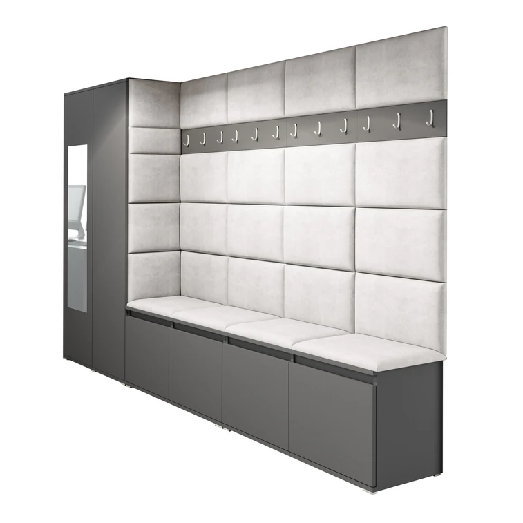 Predsieňová stena Emi 9. Obsahuje: 1x dvojdverovú šatníkovú skriňu so zrkadlom, 2x botník, 2x vešiak, 25x čalúnené panely. Čalúnené panely sa montujú priamo na stenu, na skriňu a na botník pomocou lepidla. Lepidlo nie je súčasťou balenia.