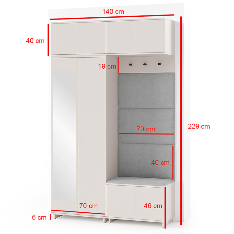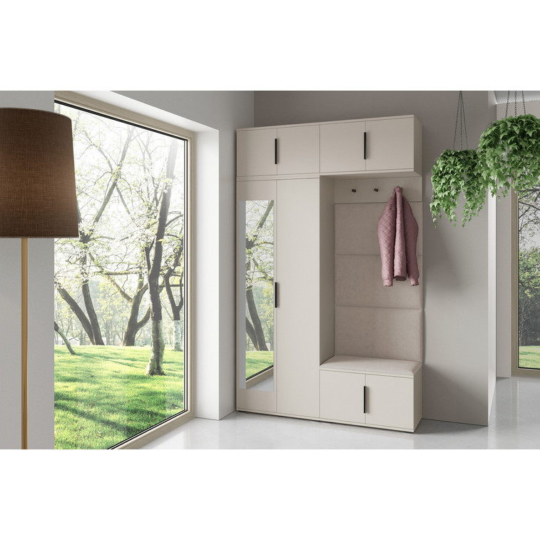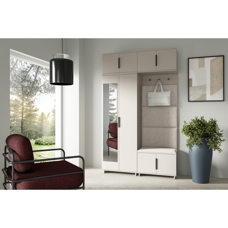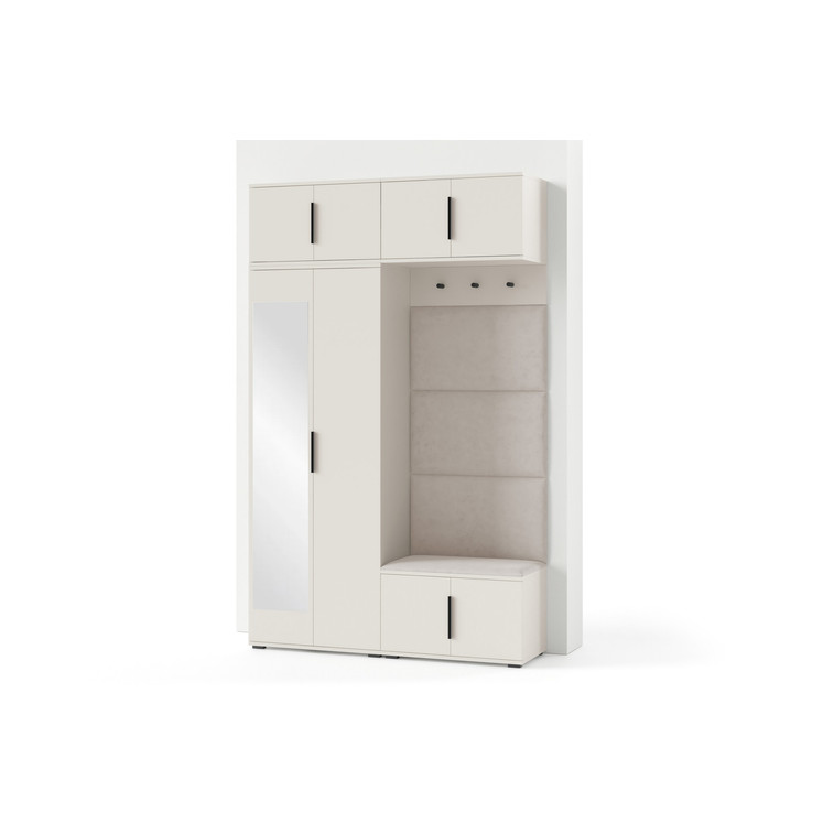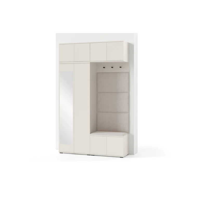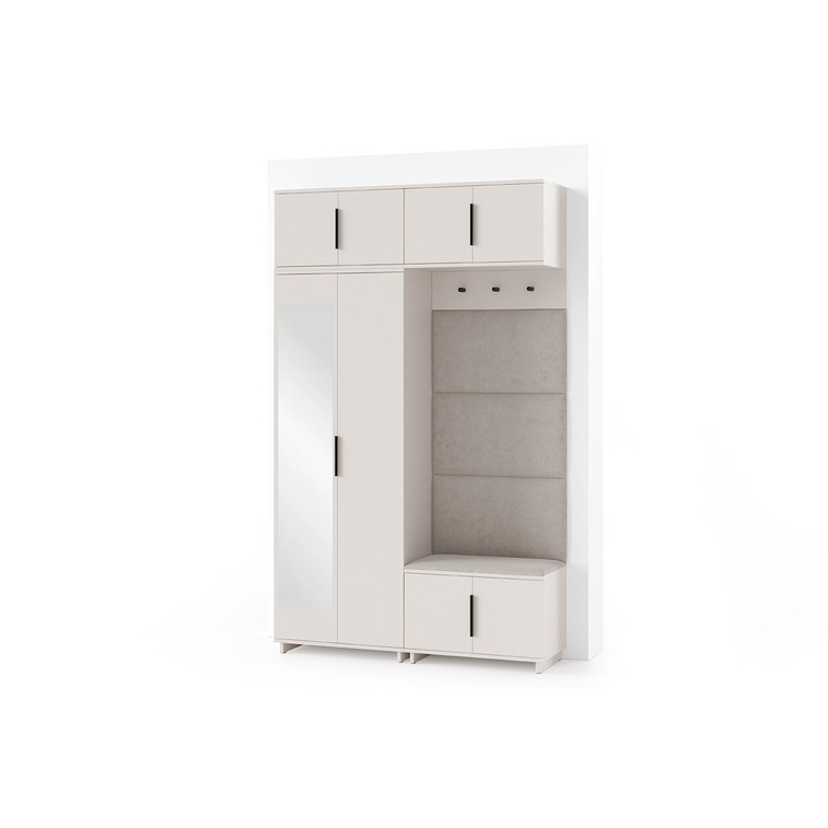 Je to praktický prvok do vstupných priestorov vášho domu. Predsieňová stena obsahuje čalúnené panely, ktoré sa montujú priamo na stenu za pomoci lepidla. Poťah panelov je tkanina Trinity. Predsieňová stena sa skladá z niekoľkých častí. Táto sada obsahuje: šatníková skriňa, nadstavba, závesná skrinka, botník, vešiak, 4 panely.