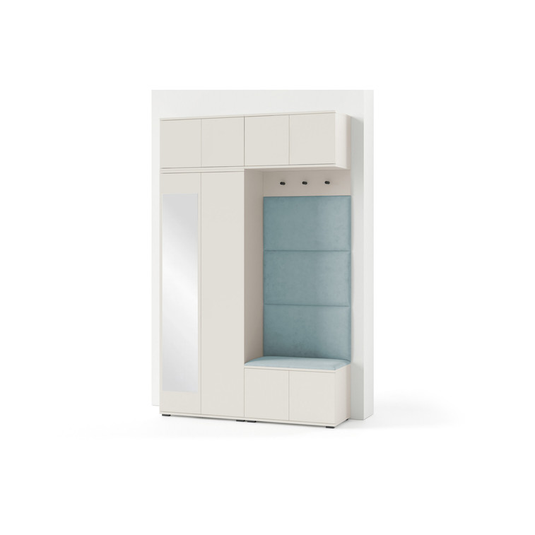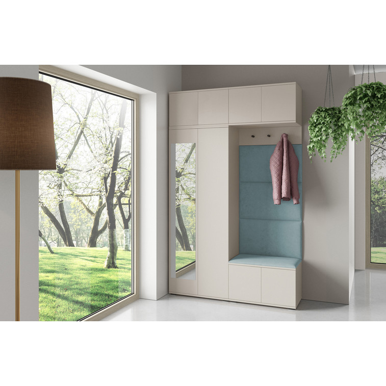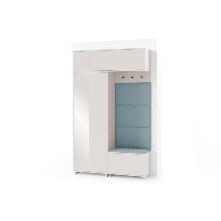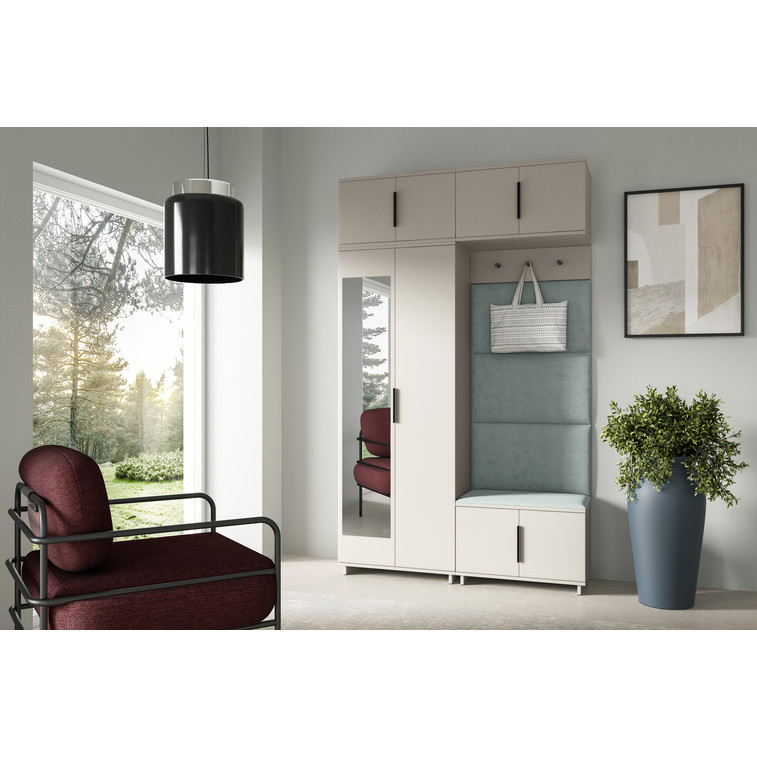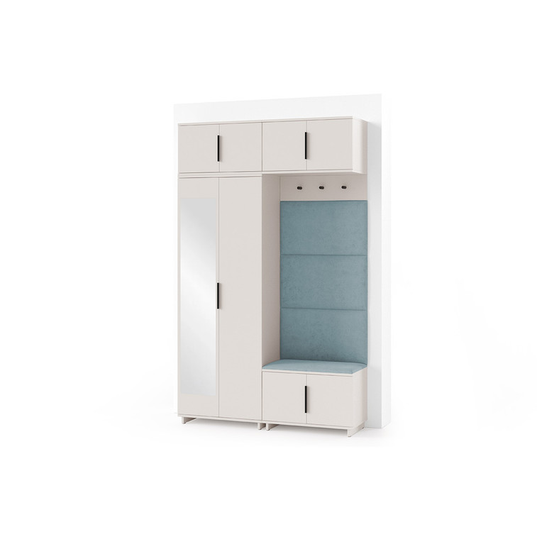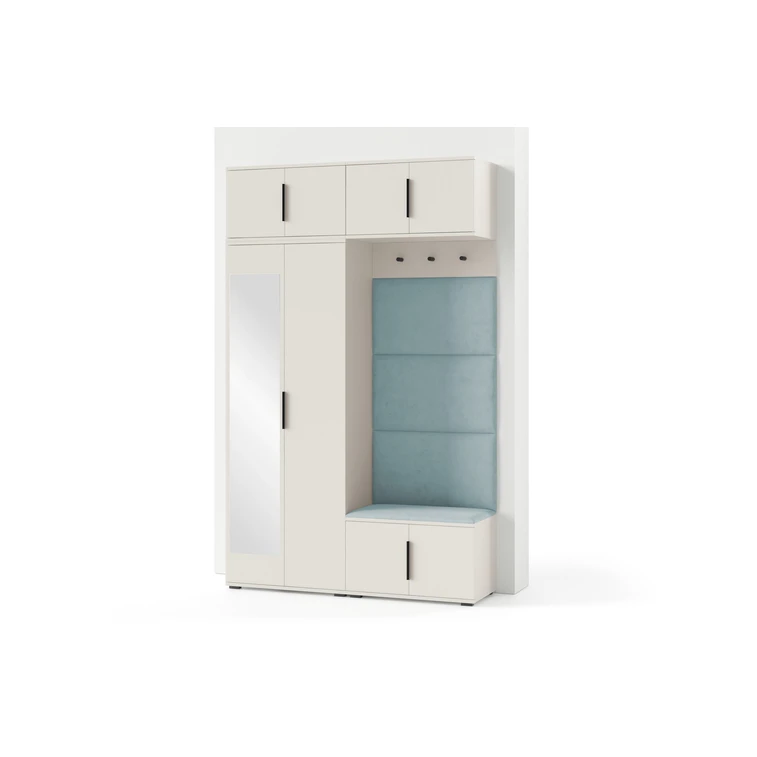 Je to praktický prvok do vstupných priestorov vášho domu. Predsieňová stena obsahuje čalúnené panely, ktoré sa montujú priamo na stenu za pomoci lepidla. Poťah panelov je tkanina Trinity. Predsieňová stena sa skladá z niekoľkých častí. Táto sada obsahuje: šatníková skriňa, nadstavba, závesná skrinka, botník, vešiak, 4 panely.