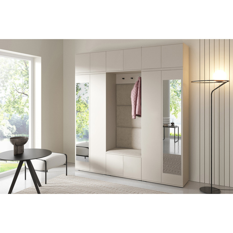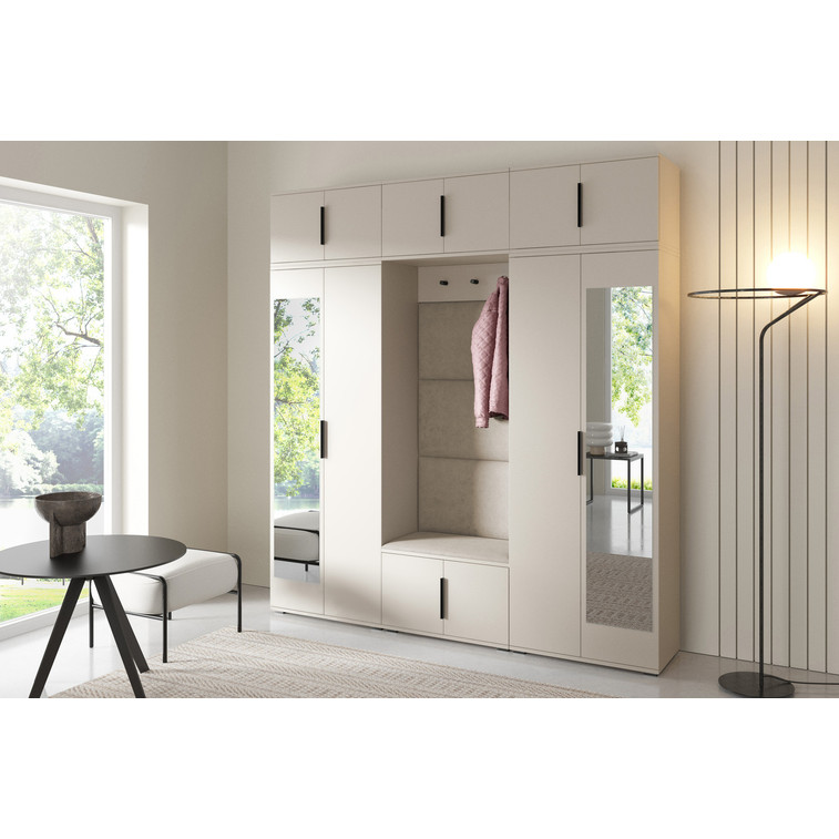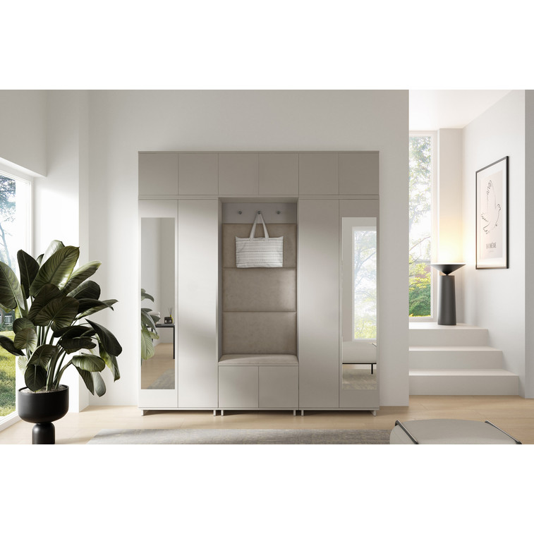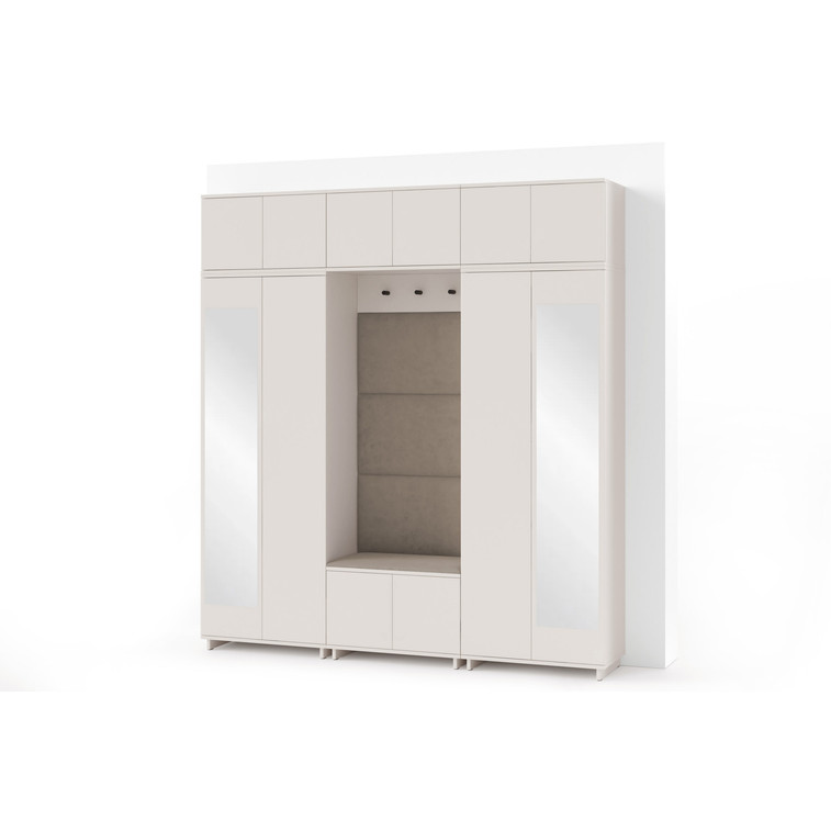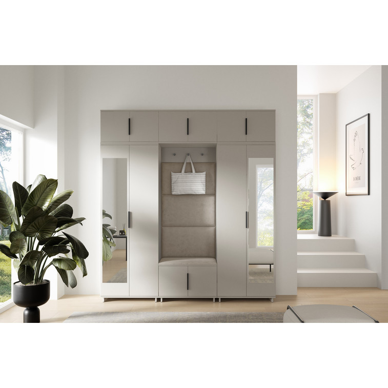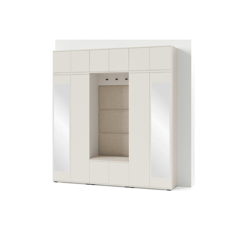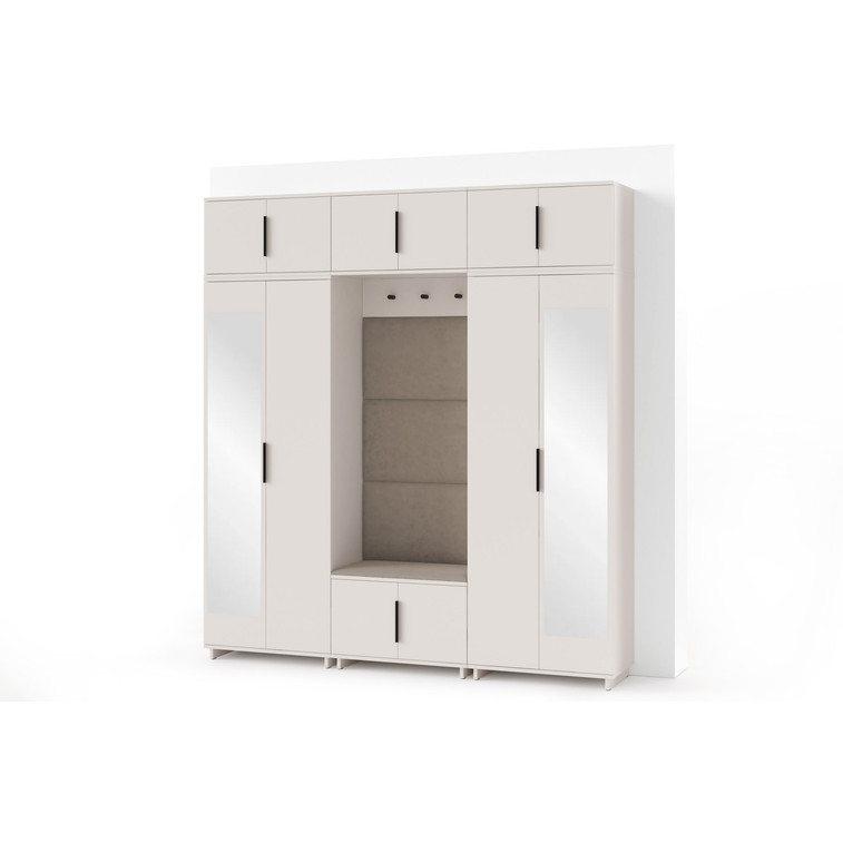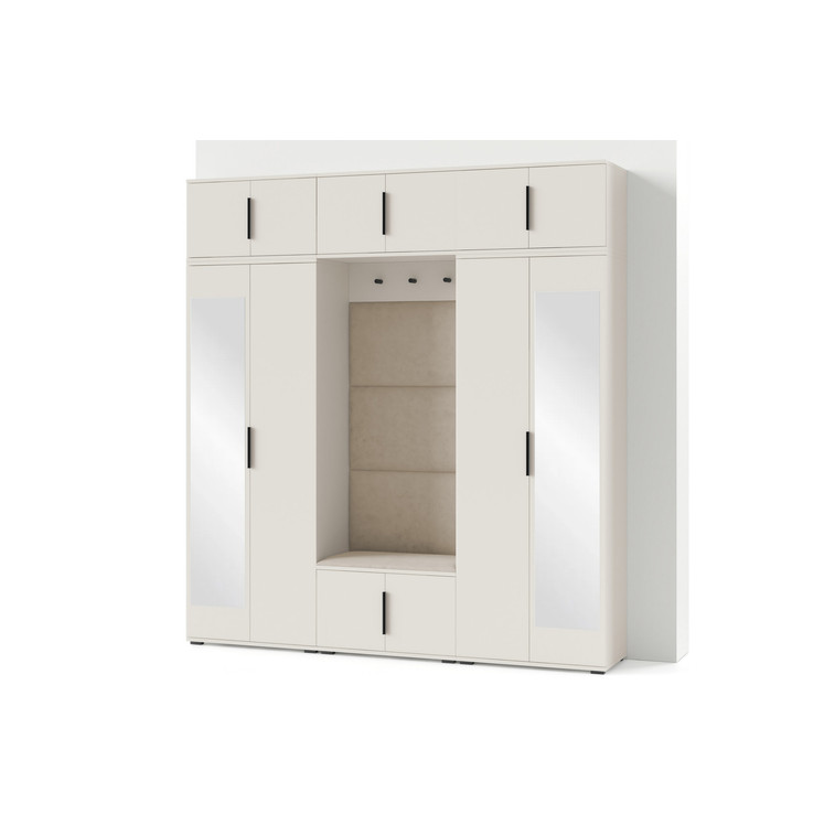 Je to praktický prvok do vstupných priestorov vášho domu. Predsieňová stena obsahuje čalúnené panely, ktoré sa montujú priamo na stenu za pomoci lepidla. Poťah panelov je tkanina Trinity. Predsieňová stena sa skladá z niekoľkých častí. Táto sada obsahuje: 2x šatníková skriňa, 2x nadstavba, 1x závesná skrinka, 1x botník, vešiak, 4 panely.