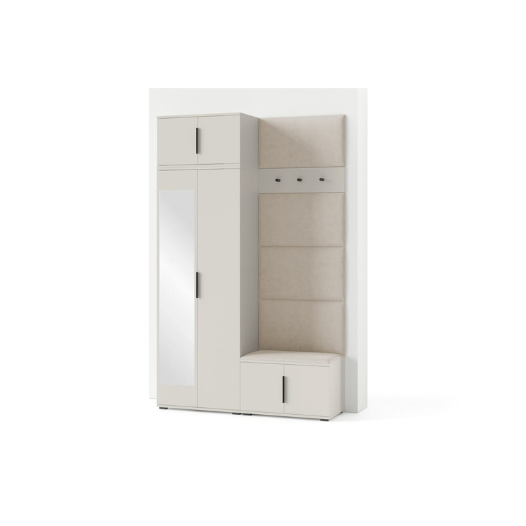 Je to praktický prvok do vstupných priestorov vášho domu. Predsieňová stena obsahuje čalúnené panely, ktoré sa montujú priamo na stenu za pomoci lepidla. Poťah panelov je tkanina Trinity. Predsieňová stena sa skladá z niekoľkých častí. Táto sada obsahuje: 1x šatníkovú skriňu, 1x nadstavba, 1x botník, vešiak, 5 panelov.